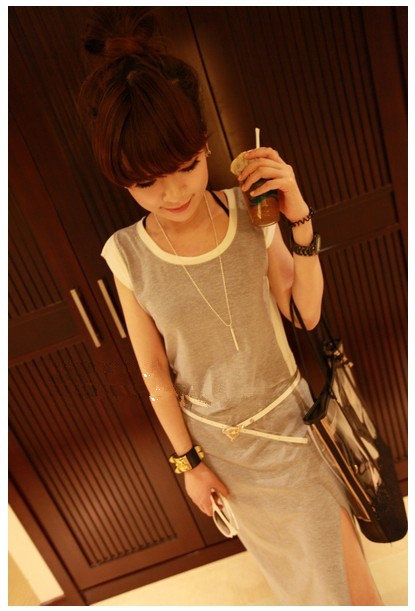❤Alina潮流服飾館 ❤洋氣歐美不規則露腿淺灰撞色顯瘦性感長裙 <送腰帶