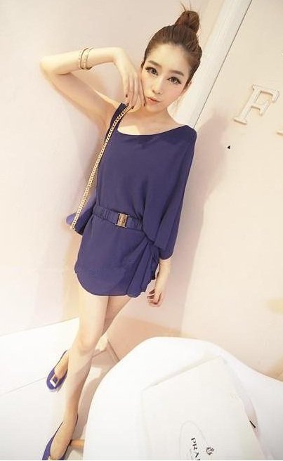 ❤Alina潮流服飾館 ❤系腰帶單肩雙層不規則雪紡連衣裙-藍色